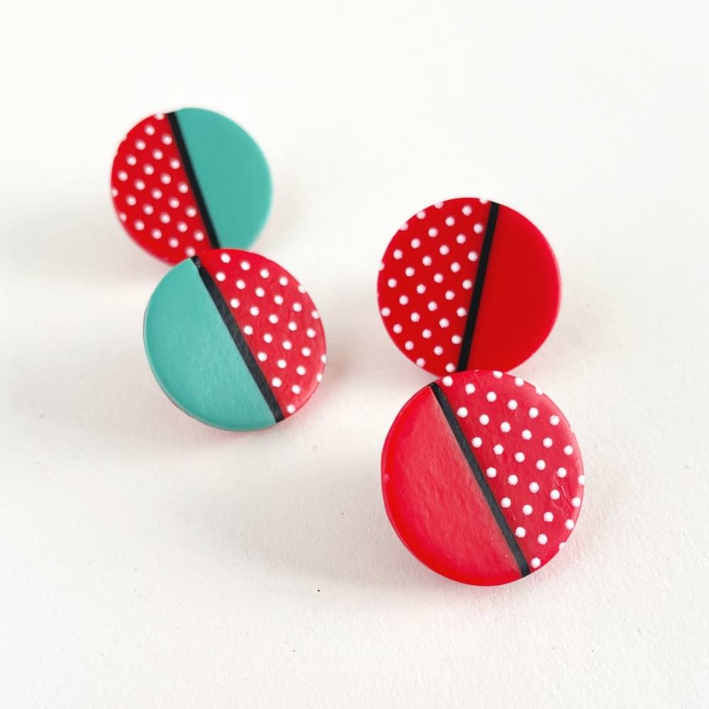 Pendientes botón pequeños y medianos con dos estampados, el básico con estampado de puntitos blancos sobre fondo rojo y el combinado donde combinan una parte roja con puntitos con una parte de un color liso con el color distintivo de las diferentes “colles”