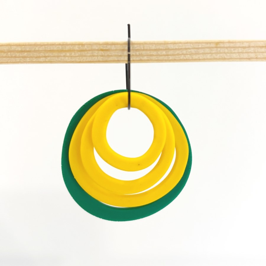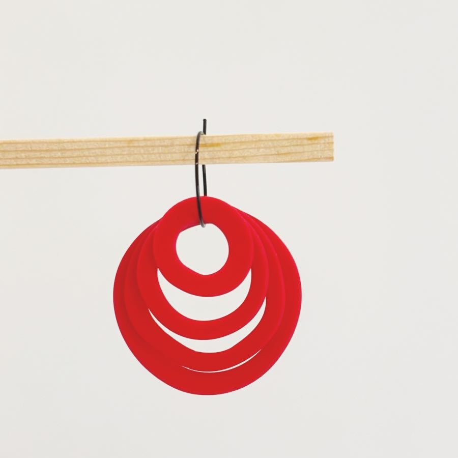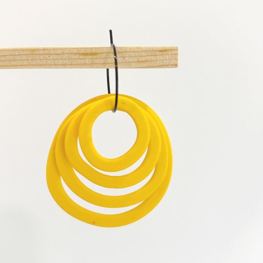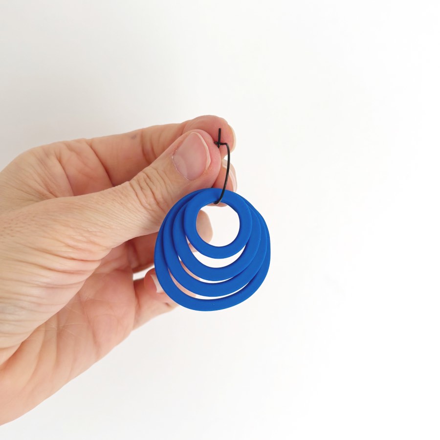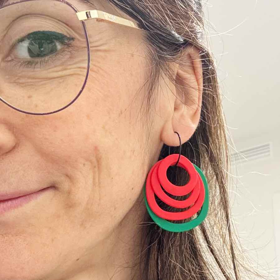 Estos originales pendientes en forma de rosa geometrica, están diseñados para que te sientas auténtica y poderosa. He jugado con la geometría para crear una rosa moderna y estilizada, compuesta por cuatro círculos concéntricos de arcilla polimérica que bailan con cada uno de tus movimientos. Van colgados de un elegante aro de acero inoxidable de 20 mm en color negro, que le da ese toque contemporáneo que tanto nos gusta.